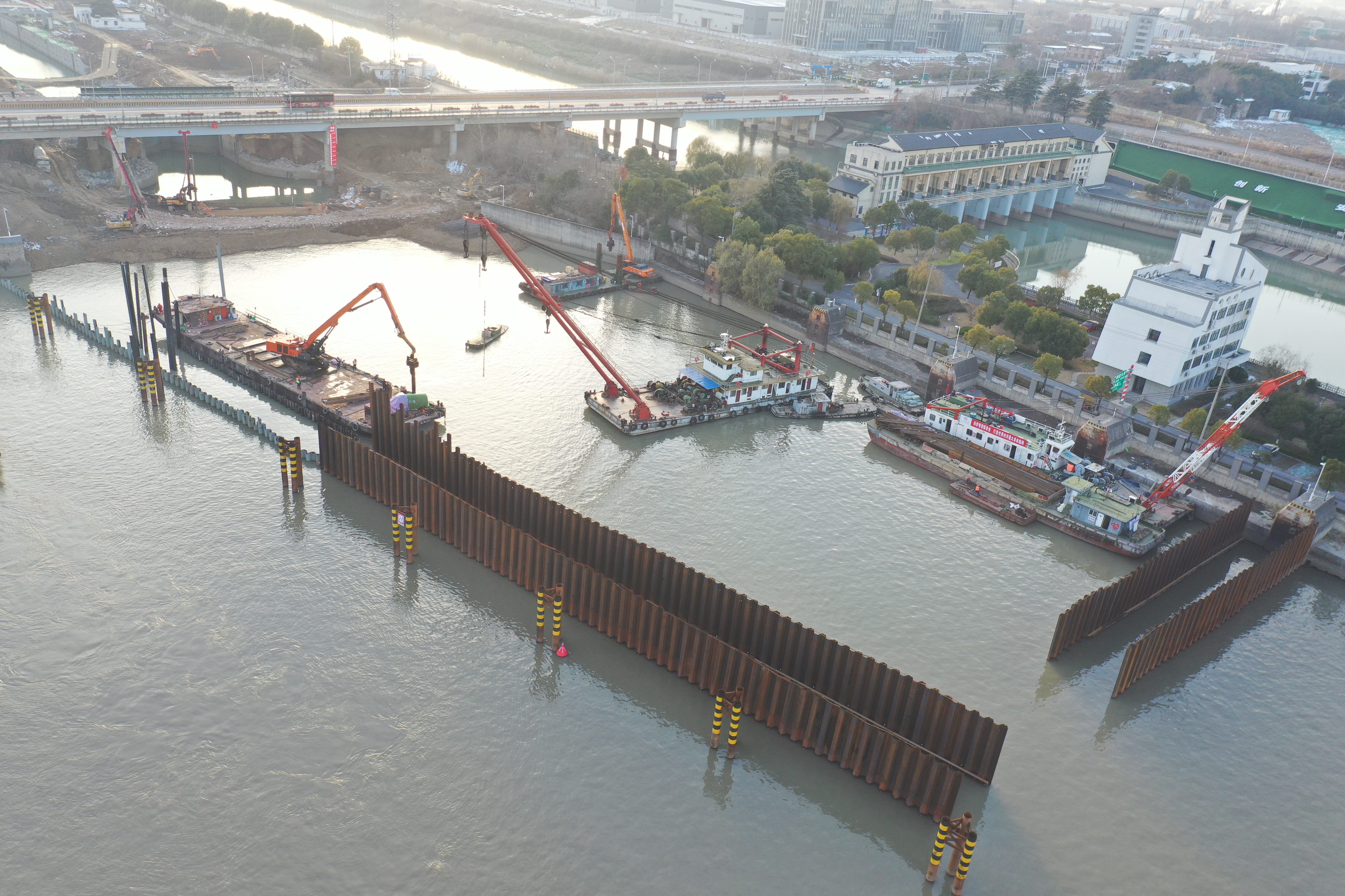 諫壁一線船閘擴容改造工程是加快打造更具特色“水運江蘇”的重點項目,建成后將成為世界內河最大單梯級船閘。自進場以來,該項目便受到各界廣泛關注。面對工期緊、施工任務重、沒有進場便道等不利情況,項目部迎難而上,多措并舉,迅速打開工作面,爭分奪秒保障項目順利推進。通過全體參建人員的拼搏努力,目前已完成三場建設及配電房施工,完成圍堰鋼板樁打設1025根、土方開挖及閘首平臺回填6萬余方、支護灌注樁施工101根,完成產值5100萬元。